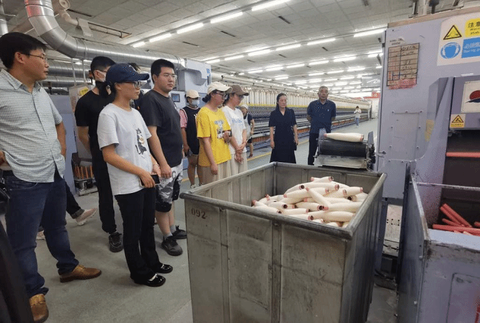 在悦达棉纺王厂长的带领下,师生参观了生产厂区,详细了解了生产车间内部环境和生产设备等情况。